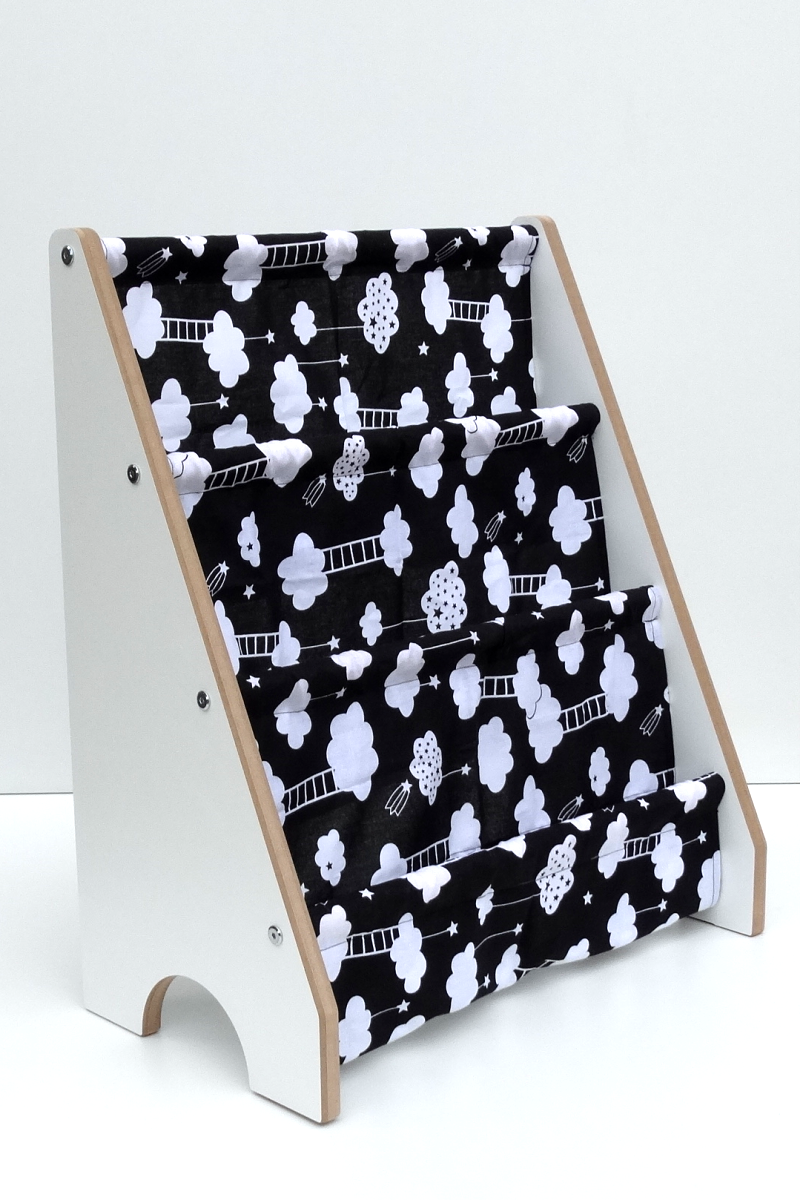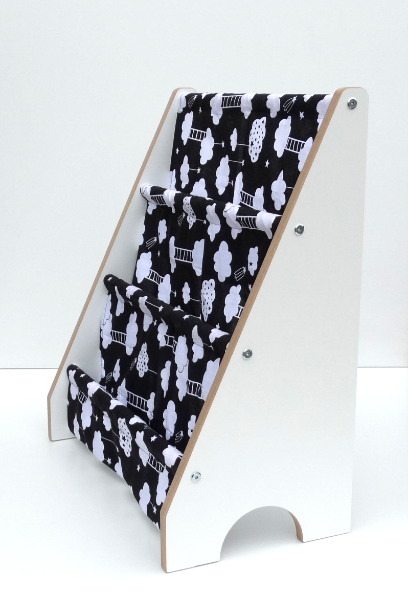 Regał na książki dla najmłodszych. Wykonany z drewna, MDF oraz przyjemnego w dotyku materiału. Jego uniwersalny wygląd dopasuje się do każdego wnętrza. Dostępny w kilku wariantach kolorystycznych.